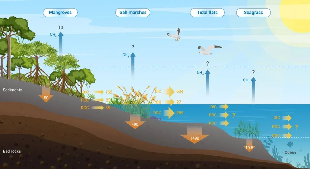 为了达到《巴黎协定》的目标,2020年中国政府承诺在2060年之前实现碳中和。除了大规模的减排脱碳,还需通过自然生态系统增加碳汇,以实现二氧化碳净零排放的总目标。海岸带蓝碳生态系统(Blue Carbon Ecosystems, BCEs),包括红树林、盐沼和海草床等,具有高效的二氧化碳吸存能力,因此保护和恢复这些生态系统成为重要的“基于自然的解决方案(Nature-based Solution, NbS)”。