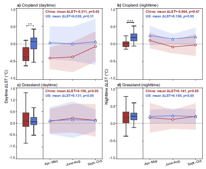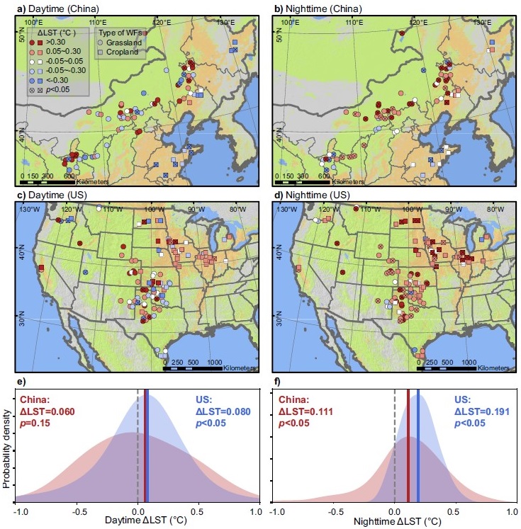 中国科学院华南植物园生态与环境科学中心武东海研究员等科研人员,选择目前最大的两个风电装机容量国家(中国和美国)为研究区,基于遥感观测数据,发现美国的风力发电场相较于中国产生了更强的升温效应(图1)。进一步分析表明,两国风力发电场对地表温度影响的差异主要来自于农田区域,中国的农田风电场相较于美国夜晚增温不明显,白天引起了显著的降温效应(图2)。农田风电场对地表温度影响的差异可能由两国农业灌溉水平的不同所导致,即受到灌溉的农田风电场有更加充足的水分进行蒸散,较强的蒸散有助于抑制地表温度的升高。相对而言,在受到较少人类管理的草地区域,两国的风发电场均造成升温的影响,且影响幅度较为一致(图2)。