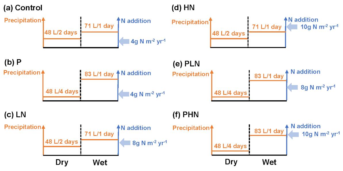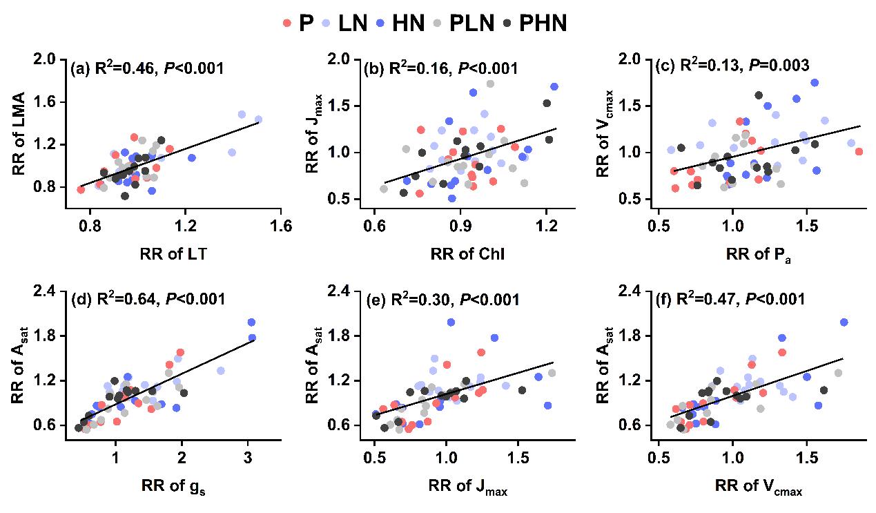 研究结果表明:1)降水变化显著降低了黧蒴锥的饱和光合速率,主要与叶片氮浓度降低有关。降水变化与氮沉降的交互作用可通过增加黧蒴锥的叶片氮浓度来增强其饱和光合速率,表明氮沉降可以缓解降水变化导致的氮限制;2)降水变化和高氮沉降降低了降香黄檀的饱和光合速率,主要与最大电子传递速率和最大羧化速率的降低有关;3)高氮沉降通过增加海南红豆的气孔导度和最大羧化速率来增强其饱和光合速率;4)未来降水变化和氮沉降可能会抑制降香黄檀的生长,但氮沉降可能会有利于海南红豆的生长。我们的研究为南亚热带人工林树种的筛选提供了重要的理论支撑。