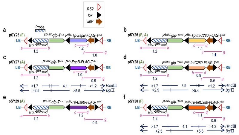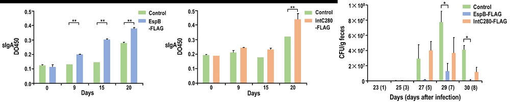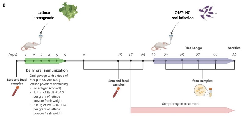 中国科学院华南植物园联合阿根廷Instituto de Agrobiotecnolog a y Biolog a Molecular INTA-CONICET的研究人员自2015年起致力于研发O157: H7的植物口服疫苗。他们首先选择了能有效激活免疫反应的EspB和 -intimin C280作为抗原基因,设计了带有不同启动子、终止子等元件组合的表达载体(图1)。然后利用容易种植、生物量大且能直接食用或制成冻干粉的生菜为作寄主植物,通过农杆菌介导的遗传转化方法获得了能稳定遗传并能高表达抗原蛋白的生菜株系。蛋白检测结果表明,抗原在嫩叶中的含量最高:在苗龄为30天的T2植株的未完全展开的叶片中,EspB和 -intimin C280含量分别达到32和51 g/ g鲜重。若用含< 3 g抗原蛋白的生菜粉末对小鼠进行连续6天的经口灌胃(图2),即可诱导小鼠产生粘膜免疫反应,并减少EHEC O157: H7的定植(图3)。由此可见,这些转基因生菜均具有制成动物口服疫苗的潜力。为提高转基因生菜的生物安全性,研究人员在转基因株系中加入了重组位点lox、RS2(图1),以便日后能使用Cre-lox和CinH-RS2的重组系统对标记基因和整串转基因进行删除,以避免转基因的漂移所带来危害。此外,由于这些转基因株系中还含有attP重组位点(图1),因此,人们还能通过Bxb-att和Cre-lox系统的综合使用,定点整合新的抗原基因或者利用新基因替换旧基因,升级生菜口服疫苗。