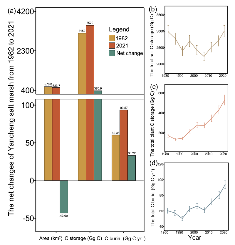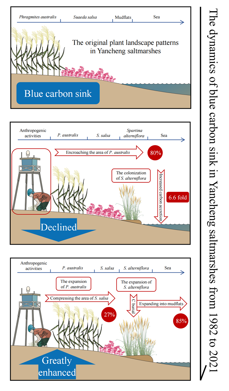 中国科学院华南植物园海岸带生态系统过程与环境健康研究组为了探究在双重因子(植物入侵和人类活动)的驱动下,盐沼湿地过去的几十年里景观格局及其碳汇功能的变化。中国科学院华南植物园海岸带生态系统过程与环境健康研究组以盐城滨海湿地为研究对象,综合运用遥感分类与数据整合的方法,研究了1982-2021年间来植物入侵和人类围垦在时空尺度上对盐城盐沼湿地蓝碳碳汇功能的影响。