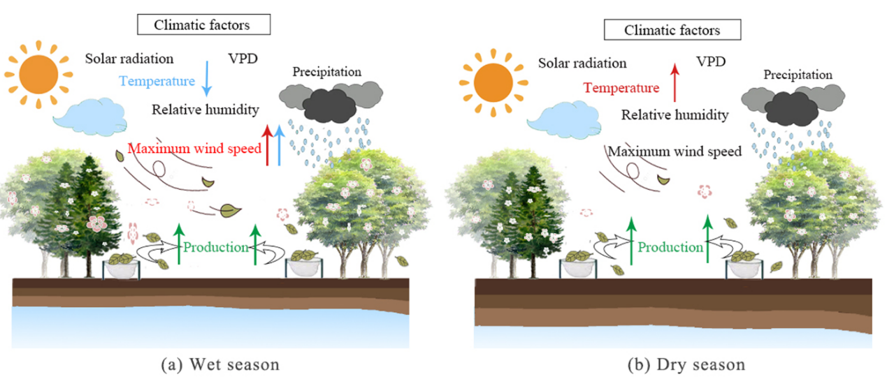 依托鼎湖山森林生态系统定位研究站森林凋落物及其组分的长期监测(2005-2018年),华南农业大学林学与风景园林学院刘效东团队联合中国科学院华南植物园、中山大学等单位,研究了季风常绿阔叶林、针阔叶混交林凋落物的组分及其长期动态特征,揭示了气温和极端风速对森林凋落物产量及其不同组分的深刻影响(气温尤其是高温在湿季影响凋落物形成、在干季促进凋落物凋落而呈现不同的季节作用特征;极端风速显著增加了枝在凋落物总量中比例,但对年凋落物总量影响不显著),指明了区域气候变化及水热格局的极端化发展将进一步加剧森林生态系统碳与养分循环过程的复杂性。