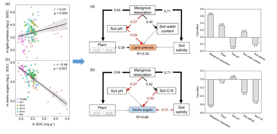 中国科学院华南植物园生态中心博士后覃国铭等科研人员,通过在珠海淇澳岛红树林保护区的野外试验回答了这一科学问题。他们首先以木质素酚和氨基糖分别指示植物和微生物来源的有机碳组分,对比分析了两者在红树林恢复过程中对土壤有机碳的贡献及其影响因子。结果显示,红树林的恢复显著提高了土壤中木质素酚和氨基糖的含量,真菌残体的累积量要显著高于细菌。木质素酚的形成主要受树木生物量、土壤总氮、pH和盐度的影响,而土壤微生物生物量、土壤碳氮比和pH值是影响氨基糖形成的主要因子。总体而言,随着红树林的恢复,植物来源组分在有机碳中的占比呈增加趋势,而微生物来源组分则呈相反趋势。该研究通过将土壤有机碳来源分为植物和微生物来源,发现红树林土壤中的有机碳稳定性不高,当土壤从厌氧到好氧的条件转换会导致固存在红树林土壤中的有机碳流失。因此,准确识别蓝碳生态系统中的土壤碳源有助于阐明土壤碳固定机制及其对环境变化的响应。