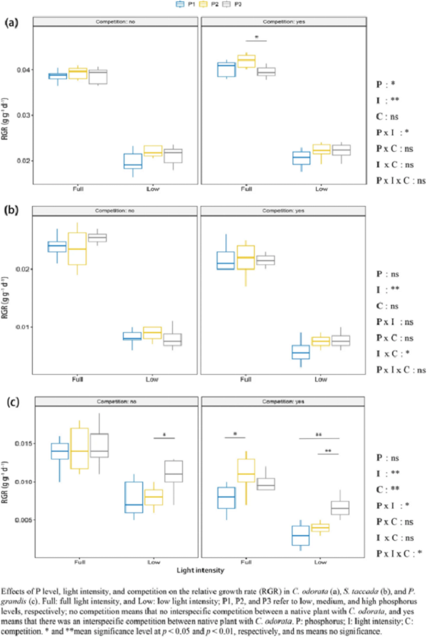 图. 土壤有效磷含量和光照强度对飞机草、草海桐和抗风桐相对生长速率的影响