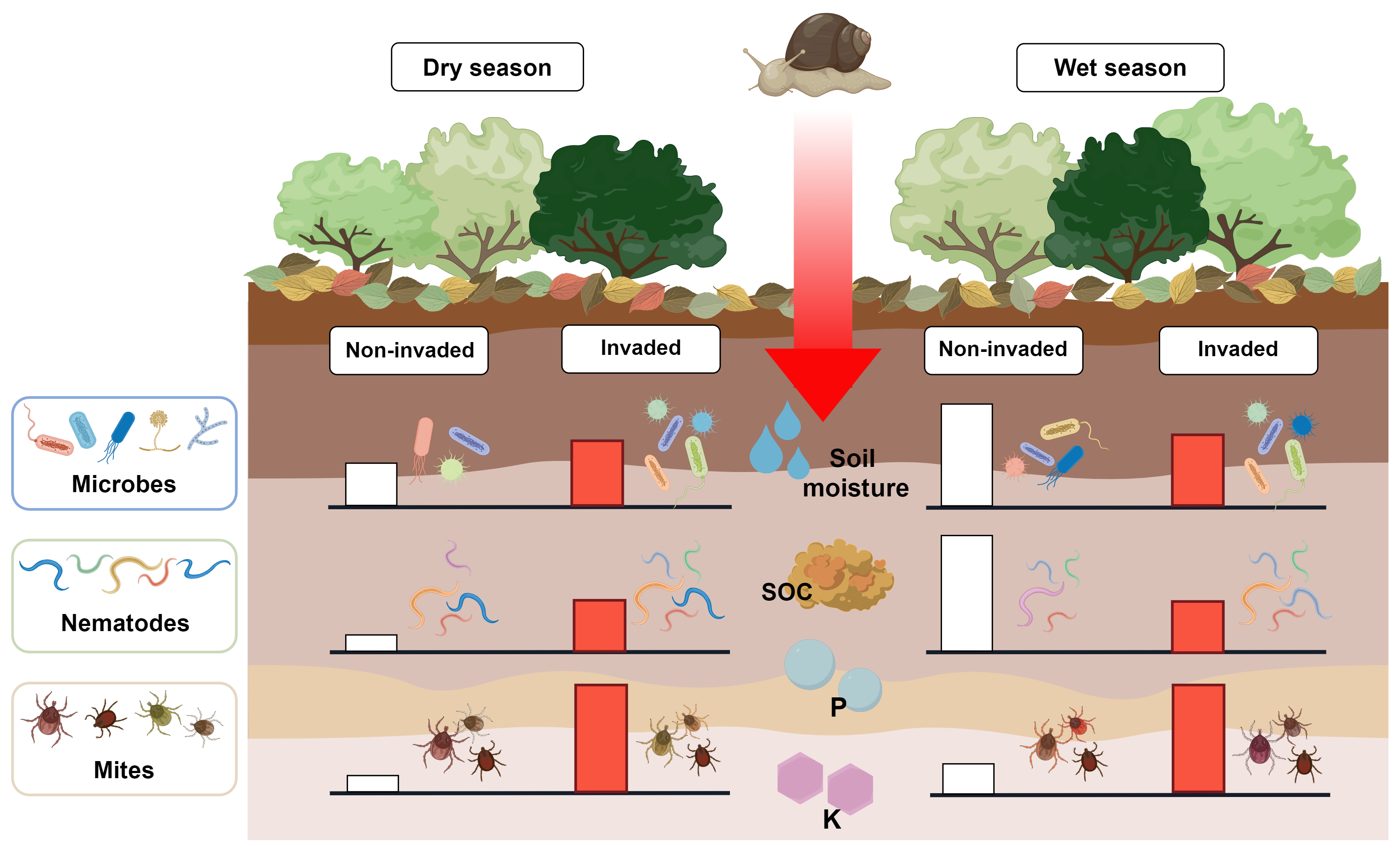 中国科学院华南植物园恢复生态学任务团队吴文佳助理研究员和王俊研究员,基于对我国西沙群岛的调查(图-1),发现非洲大蜗牛入侵对原生土壤生物多样性的影响与采样季节密切相关。蜗牛入侵在干季增加土壤真菌生物量、微生物多样性和线虫丰度,而在湿季减少;蜗牛入侵增加了螨虫丰度和多样性,而但降低了土壤酶活性;蜗牛入侵使土壤线虫群落组成、真菌细菌比值和革兰氏阳性细菌:革兰氏阴性细菌比值的季节性差异均一化;蜗牛入侵对低营养级土壤生物类群的影响不大,但对高营养级的土壤生物类群的影响更显著,土壤水分、土壤有机碳、速效磷和钾是重要的驱动因子(图-2)。研究结果表明,非洲大蜗牛的入侵通过改变土壤资源有效性来削弱原生土壤生物多样性的季节性变化,微生物、线虫和螨虫对蜗牛入侵和季节的差异响应表明了土壤生物多样性对土壤生态系统变化响应的复杂性。研究结果对提升外来生物入侵影响热带珊瑚岛生态系统结构和功能的机制性理解具有重要意义。