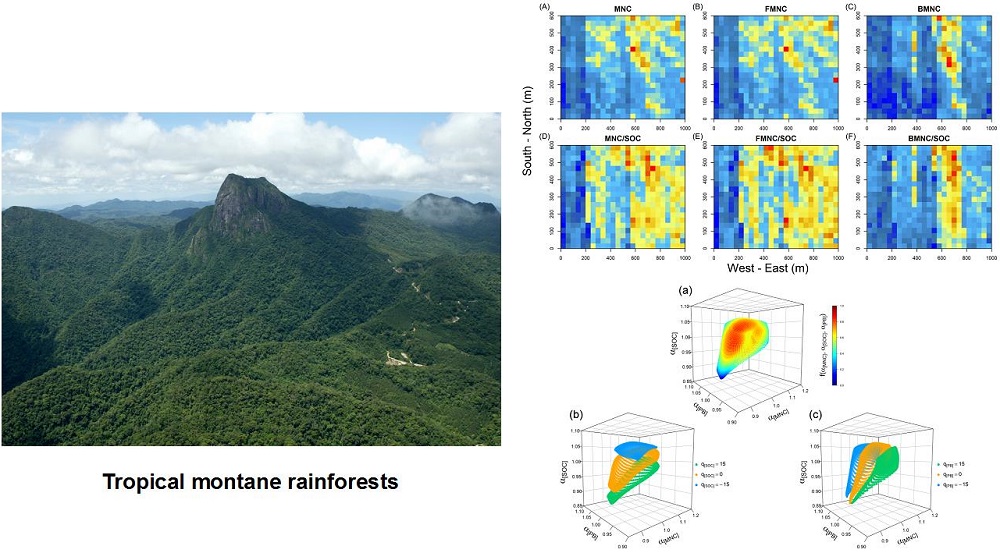 中国科学院华南植物园恢复生态学任务团队基于海南尖峰岭热带山地雨林60公顷大样地,系统研究了土壤微生物残体碳的空间分布格局及其与植物和土壤有机碳库的跨尺度关联特征。研究发现:(1)土壤微生物残体碳及其在土壤有机碳中的比例表现出较大的空间变异和显著的自相关,具有显著的高-高和低-低聚类格局,土壤、地形和植物生物量是重要的驱动因子;(2)微生物残体碳、土壤有机碳和植物生物量的空间分布具有多重分形特征并遵循幂律标度;(3)微生物残体碳表现出更强的空间异质性和更弱的均匀性,微生物残体碳和土壤有机碳之间的跨尺度相关性要比微生物残体与植物生物量之间更强更稳定。该研究首次对热带山地雨林中植物、土壤、微生物碳库的关联特征进行了跨尺度分析,提升了我们对森林碳循环机理性理解,支撑了碳分布模型的发展,也为热带森林碳管理提供了新视角。