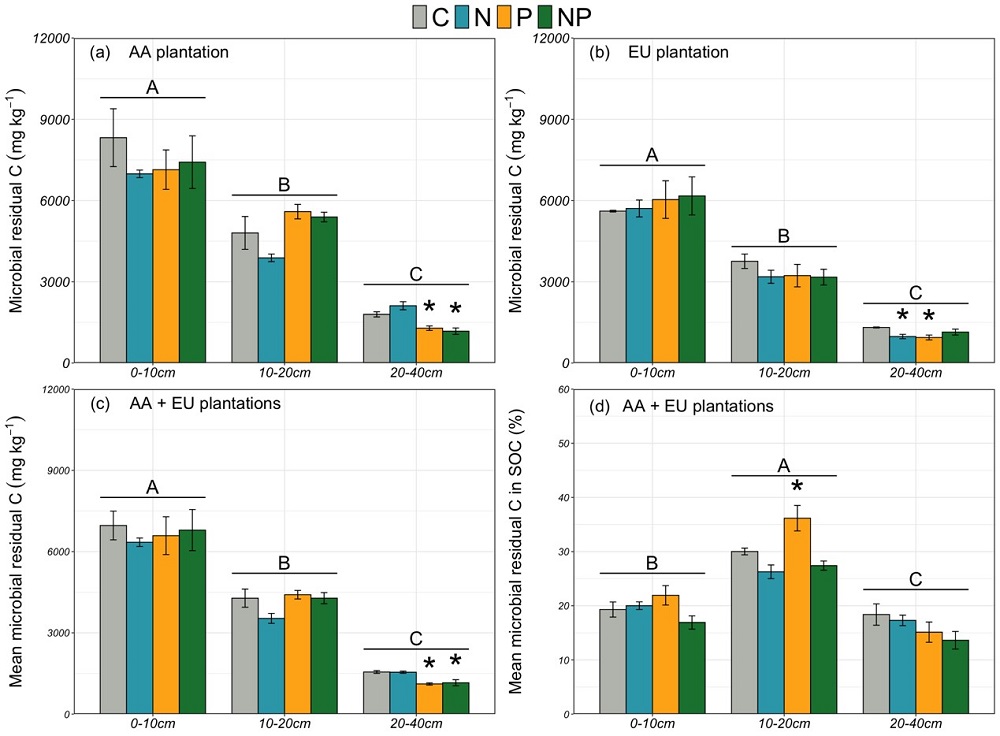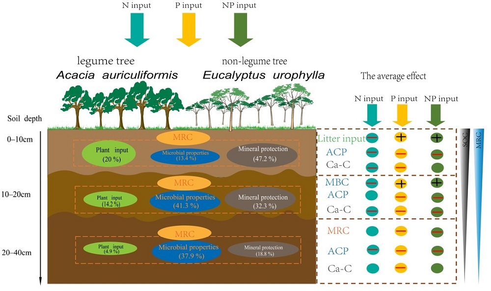中国科学院华南植物园生态中心范琳杰博士在郑棉海副研究员的指导下,依托广东省鹤山森林生态系统国家野外科学观测研究站的长期氮磷添加试验平台,选取两种典型的亚热带人工林,即大叶相思林(豆科林,Acacia auriculiformis)和尾叶桉林(非豆科林,Eucalyptus urophylla)为研究对象,探索两种亚热带人工林土壤微生物残体碳在不同土层的变化及其对长期氮和磷添加的响应机理。经过长期(12年)的氮磷添加处理,发现不同土层微生物残体碳浓度的响应存在差异。长期氮和磷添加对表层土壤(0-20cm)的微生物残体碳浓度没有显著影响。磷添加显著降低了两种人工林深层土壤(20-40cm)的微生物残体碳浓度,而氮添加仅降低了尾叶桉林深层土壤微生物残体碳浓度,对大叶相思林的影响不显著。氮和磷同时添加降低了大叶相思林的深层土壤微生物残体碳浓度,但对尾叶桉林没有显著影响。