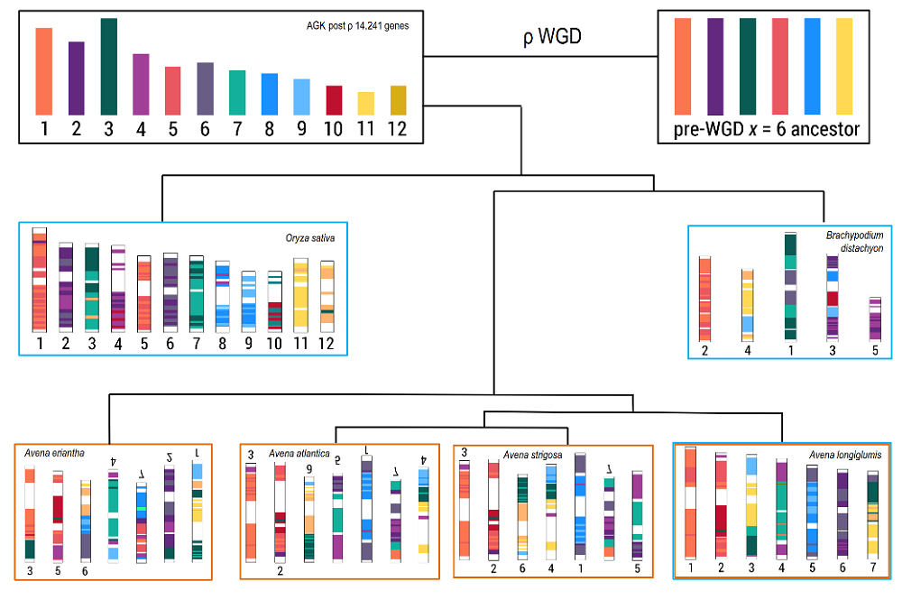 燕麦曾是土耳其安纳托利亚地区小麦田中的杂草,在三千多年前被驯化,其基因组遗传多样性丰富,表现为基因组较大 (12.6 Gb, 6x),具有类似马赛克的染色体镶嵌结构,导致燕麦染色体结构变异的进化事件知之甚少,而其二倍体野生种基因数量相似,是燕麦抗逆、适应性状的基因宝库。为此,珍稀濒危植物保育研究组刘青团队,采用基因组学技术,组装燕麦野生种基因组序列,开展比较基因组学研究,研究结果加深人们对燕麦基因组起源的认识。