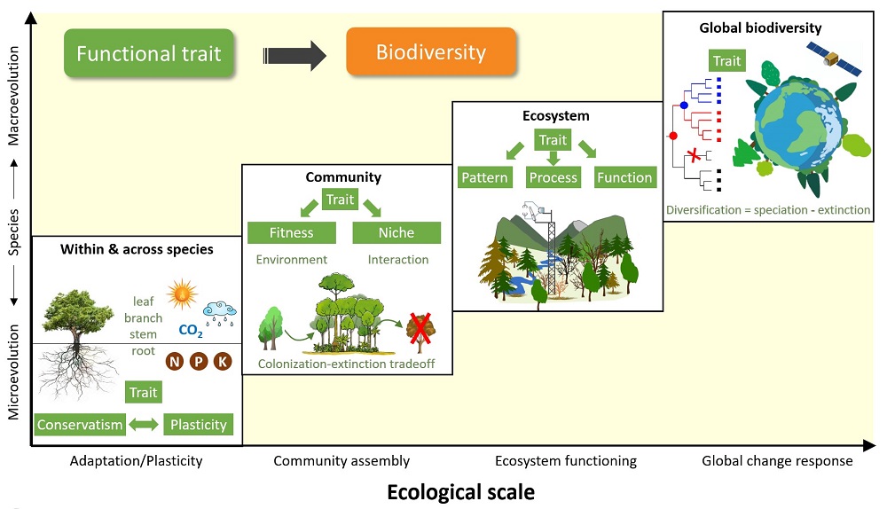 了解生物多样性的起源、分布规律和动态变化的内在机制是现代生态学的关键问题。基于功能性状的生态学(Trait-based ecology)强调植物功能性状在群落构建和生态系统功能中的重要性,然而,功能性状也可以在更广泛的时间和空间尺度上提供与生物多样性的链接。因此,需要构建一个多时空尺度、基于植物功能性状评估全球变化对生物多样性影响的研究框架,以探究生物多样性形成和维持的生理生态机制,助力未来气候变化下生物多样性的保护和预测。