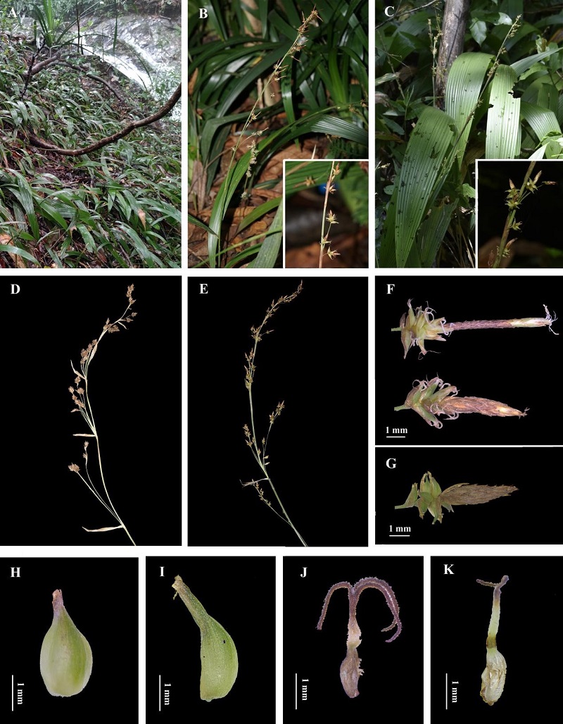 (注:A: 清远薹草生境; B, D: 清远薹草花序; C, E: 扇叶薹草花序; F: 清远薹草小穗; G: 扇叶薹草小穗; H: 清远薹草果囊; I: 扇叶薹草果囊; J: 清远薹草不成熟的果和基部膨大的花柱; K: 扇叶薹草不成熟的果和基部不膨大的花柱.