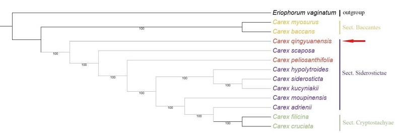 2023年7月,研究团队前往广西金秀山采集扇叶薹草和花葶薹草(Carex scaposa)的标本及分子样材料,获取新种、扇叶薹草和花葶薹草的2个核基因和3个质体基因的片段,结合NCBI中数据,采用来自2 sections和3 clades共21个物种的5个基因片段,构建ML树,支持率均高于90%,且sections和clades之间关系和前人研究结果一致,结果可信。发现相比于扇叶薹草,新种和花葶薹草亲缘关系更近,两种互为姐妹类群。因此分子证明也表明该种为宽叶薹草组一新种,基于新种模式标本的采集地,将其命名为清远薹草(Carex qingyuanensis Y.L. Li & H.F. Chen)。
