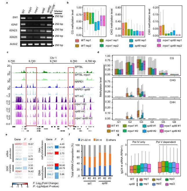 图2. SPT6L突变降低DNA甲基化但不影响DNA甲基化组分蛋白因子和小RNA的表达