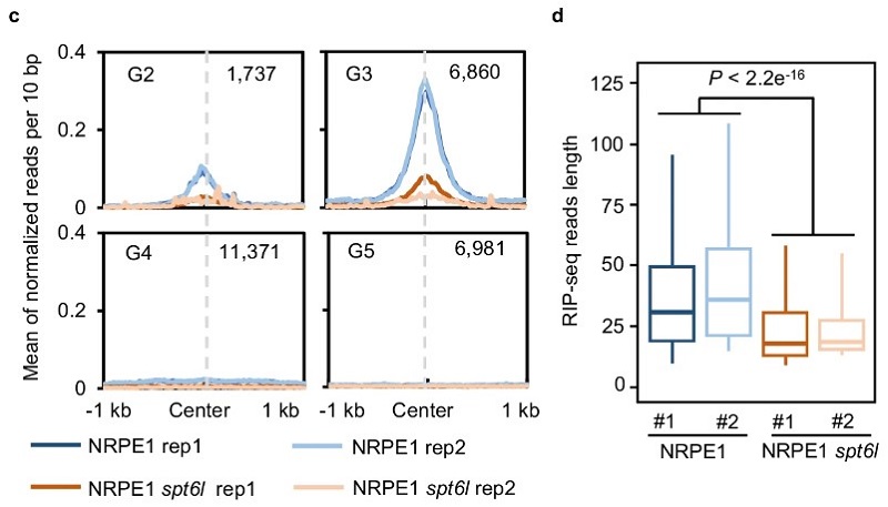 图3. SPT6L突变降低Pol V的转录产物的丰度和长度