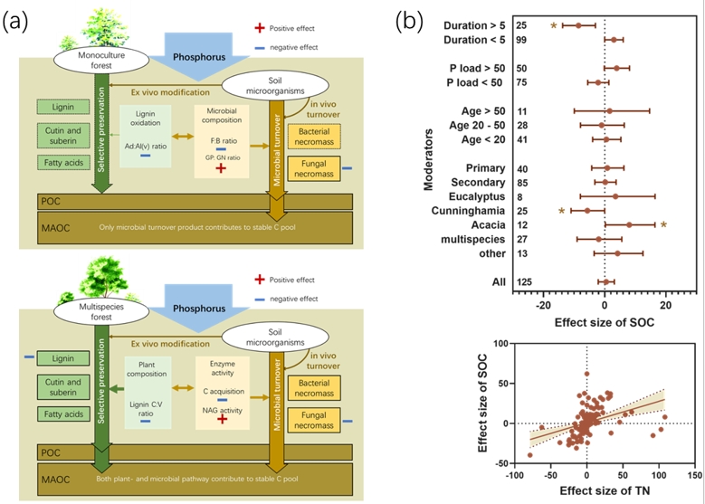 研究发现,两个亚热带人工林土壤0-20cm SOC含量未随P添加显著变化,这与整合分析结果一致。但是,土壤微生物群落组成和活性解释了亚热带森林SOC组分对P添加的差异性响应。纯林中植物底物质量较差,P添加引发土壤微生物群落组成的改变,导致微生物加速消耗微生物残体碳(MRC)以补充C源;而混交林中P添加改变植被群落组成,并促进微生物对N源的获取,从而加速了木质素和MRC的分解。混交林中微生物来源碳(特别是真菌MRC)和矿物结合有机C联系紧密,预示着长期P添加引起真菌MRC的减少将不利于热带森林土壤SOC的积累和稳定。