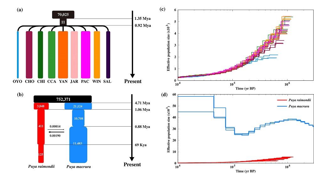 图3. 基于FASTSIMCOAL2和PSMC推断安第斯皇后凤梨和Puya macrura的群体动态历史。