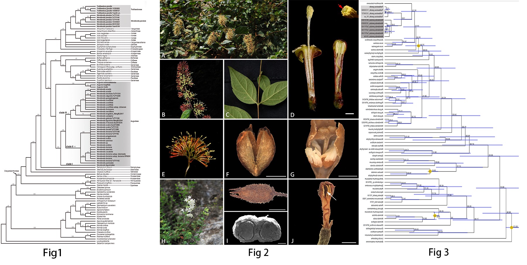 图1. 茜草科木兰茜亚科系统发育;图2. 垂枝水锦树和丁茜形态特征;图3. 木兰茜亚科族一级分化时间。