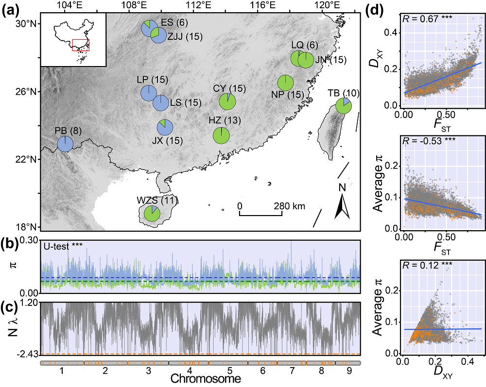图1. 伯乐树基因组多样性特征和谱系分化模式