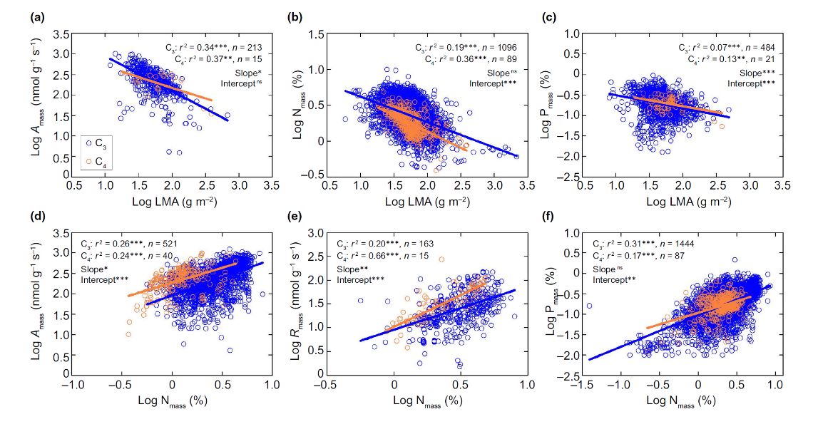 图1. C3和C4植物叶片功能性状相互关系的比较