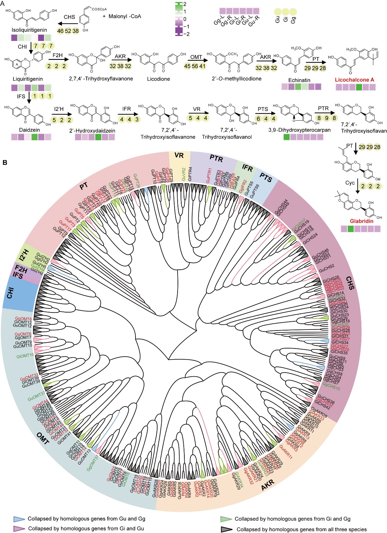 图2. 三种甘草中甘草查尔酮A(LCA)和光甘草定合成的关键基因分析