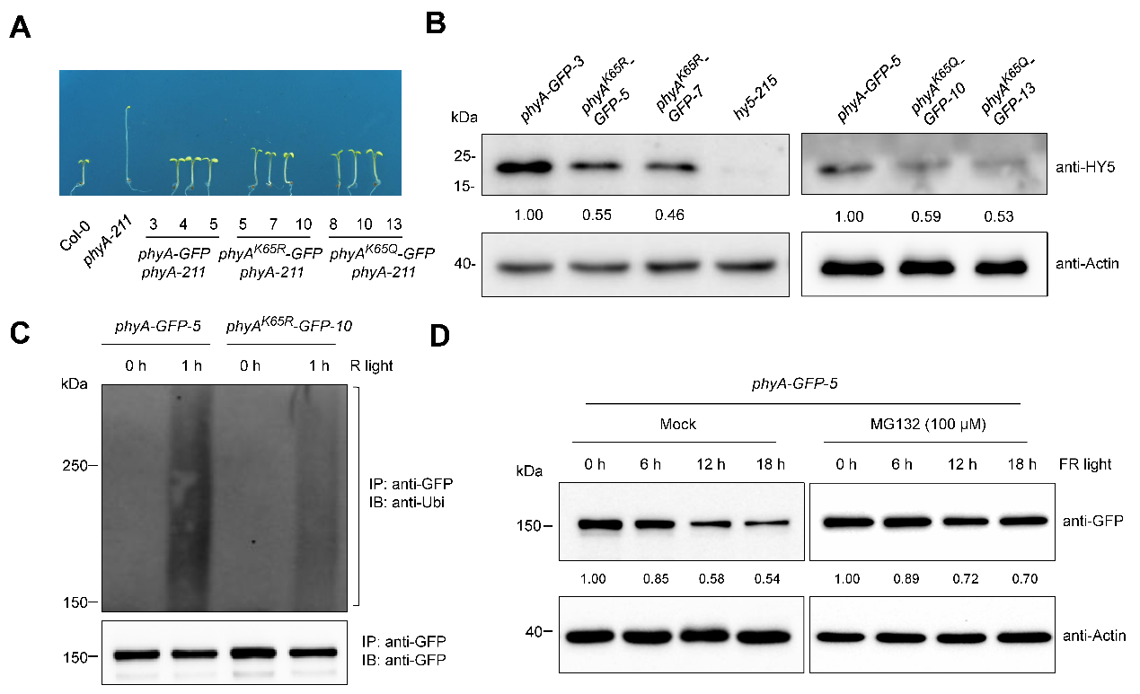 通过构建位点特异模拟乙酰化和去乙酰化的转基因回补材料,研究人员证实仅K65位点的乙酰化状态影响了phyA的生物学功能。进一步分析发现,该位点同时也是关键的泛素化修饰位点,其突变显著降低了phyA泛素化水平与降解速率,从而影响了下游转录因子HY5的水平与光响应基因的表达。免疫共沉淀实验表明,光照诱导的K65位点去乙酰化,直接促进了phyA泛素化修饰,进而被26S蛋白酶体途径降解。以上研究首次揭示光诱导的phyA降解需经历“去乙酰化-泛素化”级联反应。