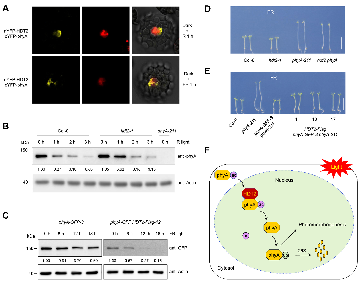 通过蛋白质复合体等互作实验发现,植物特有的赖氨酸去乙酰化酶HDT2在光照后与phyA在细胞核内特异结合。生化分析显示,照光后HDT2催化phyA的K65位点去乙酰化,促进了其泛素化和蛋白降解。超表达HDT2促进而突变HDT2抑制phyA的蛋白降解。遗传证据进一步表明,HDT2特异性参与了phyA介导的远红光信号途径。