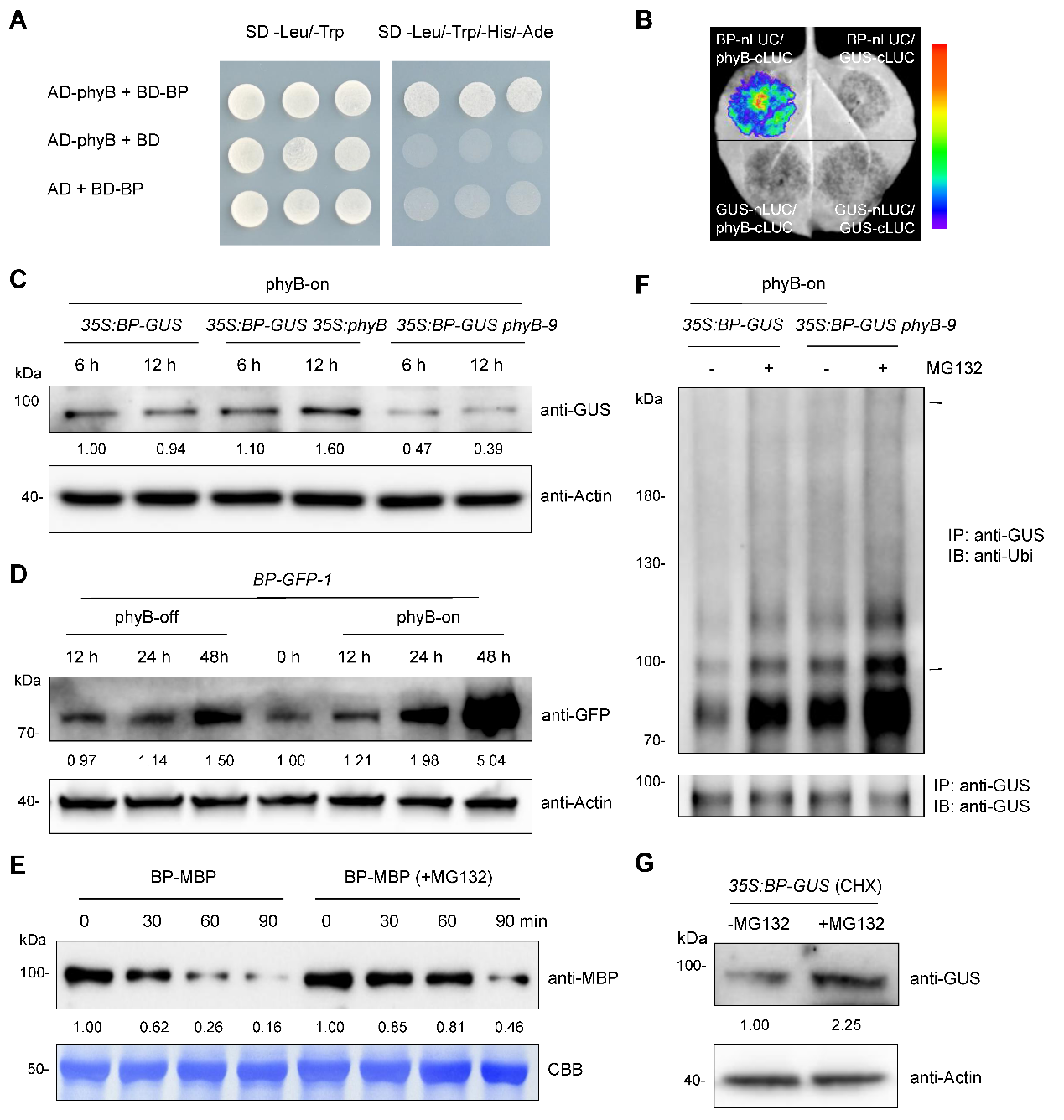 基于phyB与BP之间的遗传互作关系,研究团队进一步探究了二者在蛋白水平上的相互作用。酵母双杂交、荧光素酶互补及免疫共沉淀等实验结果表明,BP在体内和体外均能与phyB发生直接互作。为研究phyB对吸胀种子中BP蛋白稳定性的影响,研究人员分别构建了在phyB突变体和过表达株系背景下的BP转基因材料。免疫印迹分析显示,phyB过表达可促进BP蛋白的积累,而phyB缺失则导致BP蛋白水平降低。进一步的体外降解实验及MG132处理实验证明,phyB通过减少BP的泛素化修饰,从而抑制26S蛋白酶体介导的降解途径,增强BP蛋白的稳定性(图2)。
