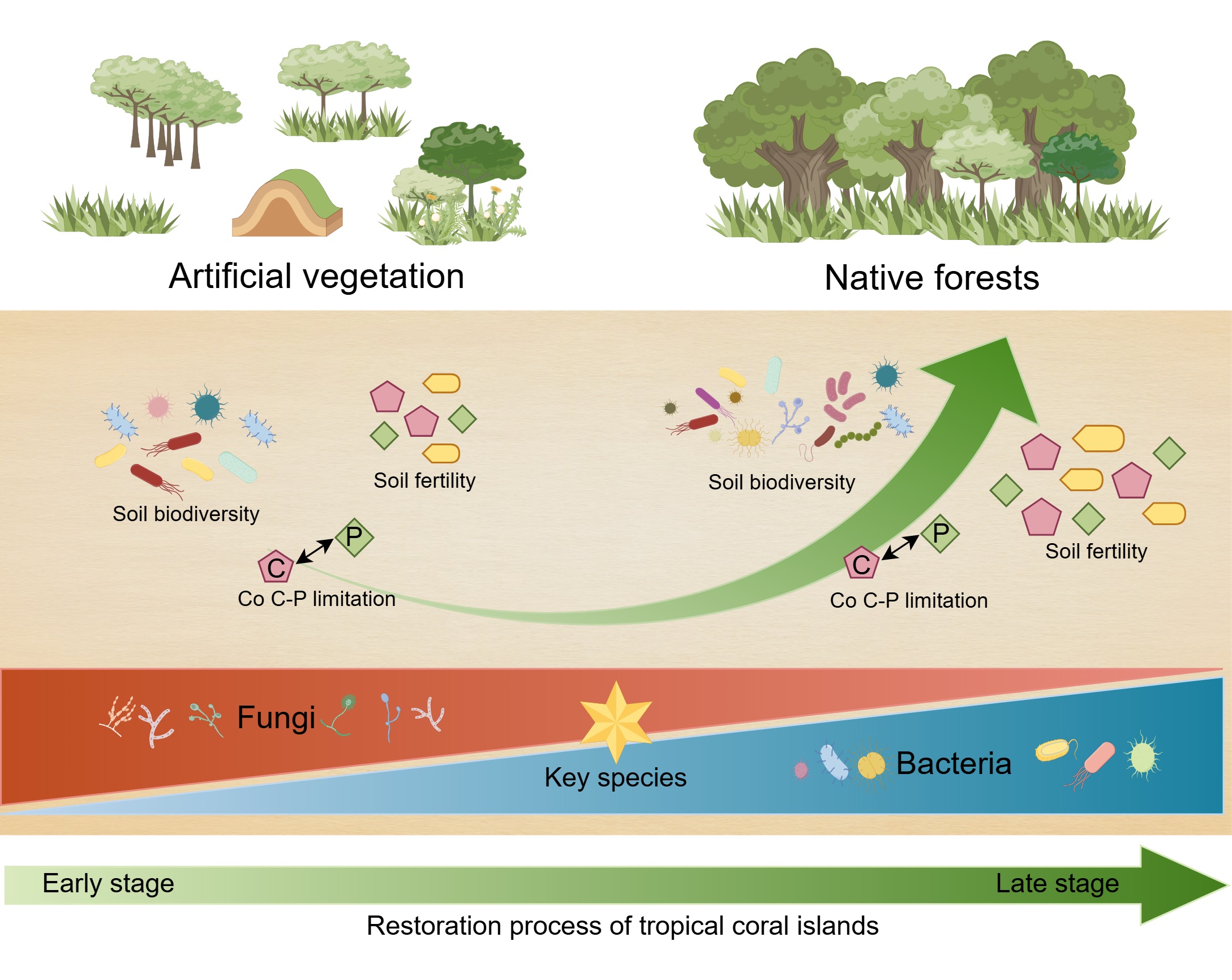 基于研究结果,研究团队提出针对性优化策略:植被构建初期可接种耐盐真菌菌剂,加速难分解碳的转化,“抢抓”恢复时间;恢复后期,可采取“少量多次”方式补充易分解碳源,促进细菌功能群落的建立;同时应结合热带珊瑚岛土壤高钙低磷的特点,配施低剂量磷肥,精准缓解“碳磷双限制”,全面提升恢复效率。建议未来开展更长周期的监测,评估不同恢复模式的可持续性,不断完善热带珊瑚岛生态恢复技术体系,为我国海岛生态安全及全球脆弱生态系统的恢复实践提供科学依据。