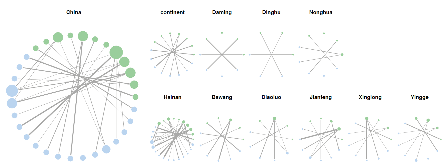 图3. 不同地理尺度下的叶下珠(算盘子属)与叶下珠蛾(头细蛾)的互作网络