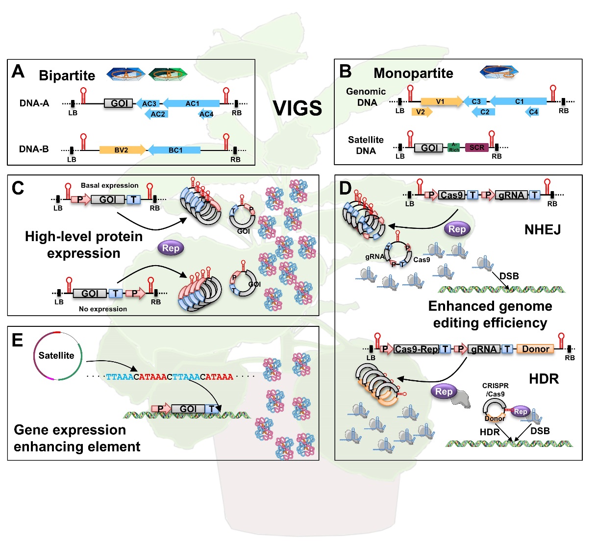 双生病毒基因组以及编码的病毒蛋白包括两大核心关键特征:茎环结构(Stem-loop)和Rep蛋白。病毒复制必需的关键蛋白Rep蛋白可以识别病毒基因组中的茎环结构,起始并完成病毒DNA的滚环复制。通过组装这两个关键的核心组件,可以构建出在宿主细胞中高效自主复制的双生病毒复制子(Geminiviral Replicons, GVRs)。作为VIGS载体,双组分双生病毒,通过替换AV1基因,插入靶标序列;而单组分双生病毒,则需要借助卫星DNA(α/β/δ卫星DNA)构建VIGS载体。在合成生物学领域,GVR依赖其高效自主复制能力,可以显著地提高蛋白质产物的产量以及GRISPR/Gas系统介导的基因编辑效率。此外,双生病毒基因组及卫星DNA中发现的多种基因表达调控元件也丰富了GVR的应用。