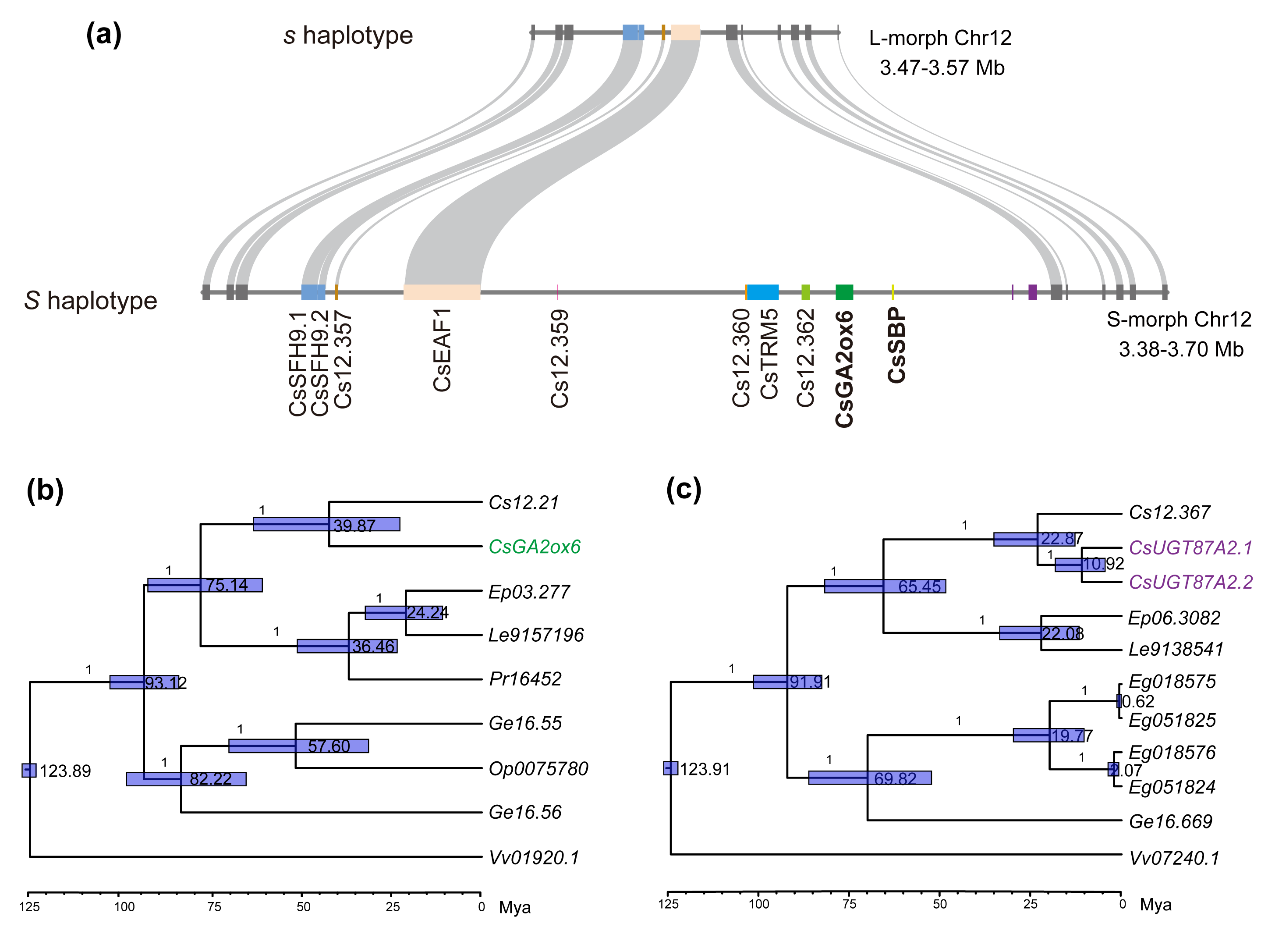 研究人员构建了橙花破布木长柱型和短柱型的染色体级基因组,结合重测序、转录组以及转基因功能验证,系统解析了该物种控制二型花柱发育的超基因结构、功能及起源演化。研究发现:(1)控制不同花型的超基因包含约180kb的半合子区域(含8个候选基因),该区域仅存在于短柱花个体中,在长柱花个体中完全缺失;(2)系统发育分析表明该超基因在演化过程中通过“逐步复制与组装”的方式形成;(3)超基因中CsSBP (Squamosa promoter-binding protein)基因在短柱花花丝-花冠筒部位特异性表达,调控花丝伸长的关键基因;(4)CsGA2ox6仅在短柱花花柱中特异性高表达,可降解活性赤霉素,是调控花柱长度的关键功能基因。转基因验证表明,在烟草中过表达CsGA2ox6可导致烟草花柱显著缩短,并且表现出类似自交不亲和的花粉管阻滞现象,提示该基因可能同时参与调控花柱长度与自交不亲和性。该研究不仅再次证实了异型花柱演化过程中存在遗传趋同机制(即S-locus均呈半合子结构),而且首次实验论证了赤霉素代谢基因在花柱长度调控中的关键作用,这一机制区别于以往研究所强调的油菜素内酯或生长素信号通路。此外,研究还提示花柱长度基因可能兼具调控自交不亲和性的功能,该发现为深入理解异型花柱类群中异型自交不亲和与花型多态性的调控机制提供了重要科学依据。