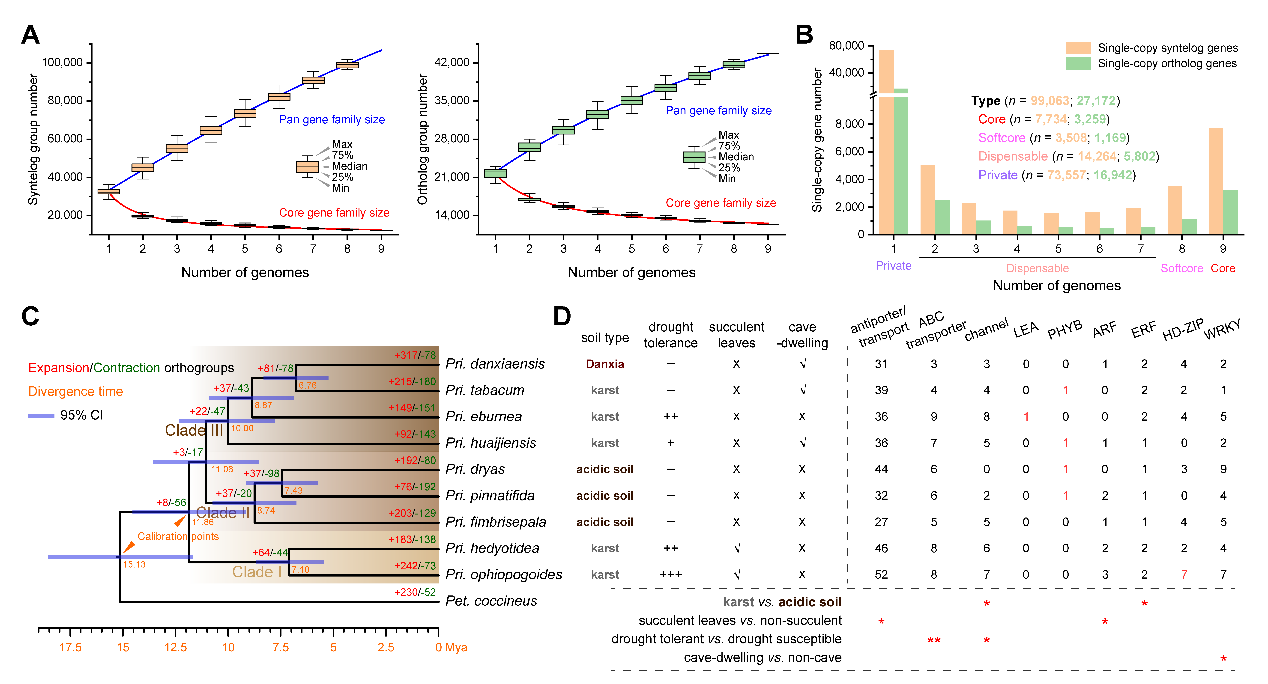 土壤专化适应是指植物对特殊或极端土壤环境的进化适应,这一机制被广泛认为是驱动植物多样化与物种形成的重要力量,但其基因组基础尚未阐明。报春苣苔属(Primulina,苦苣苔科)包含200余个物种,具有独特的生态位分化与形态多样性特征。该属植物主要专性分布于中国南方喀斯特地区的钙质土壤,少数物种则适应丹霞或酸性土壤环境,为解析土壤专化适应性机制提供了理想模型。