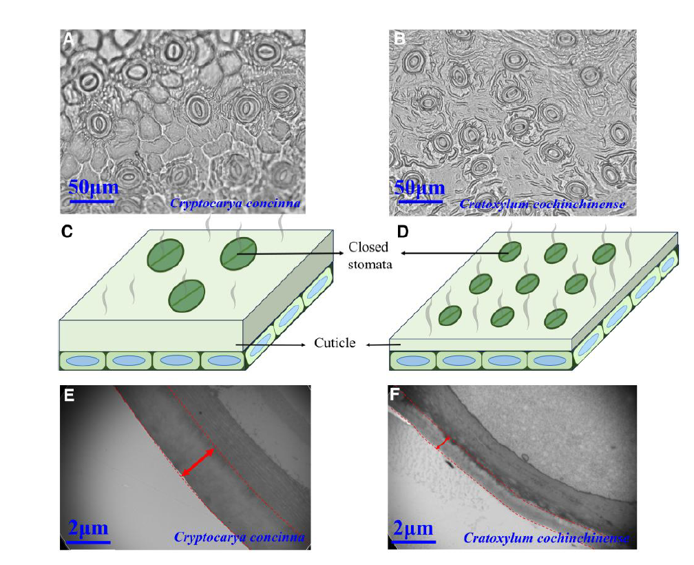 左图(A、C、E):耐荫种的气孔与角质层特征(以黄果厚壳桂Cryptocarya concinna为例);右图(B、D、F):喜光种的气孔与角质层特征(以黄牛木Cratoxylum cochinchinense为例)。