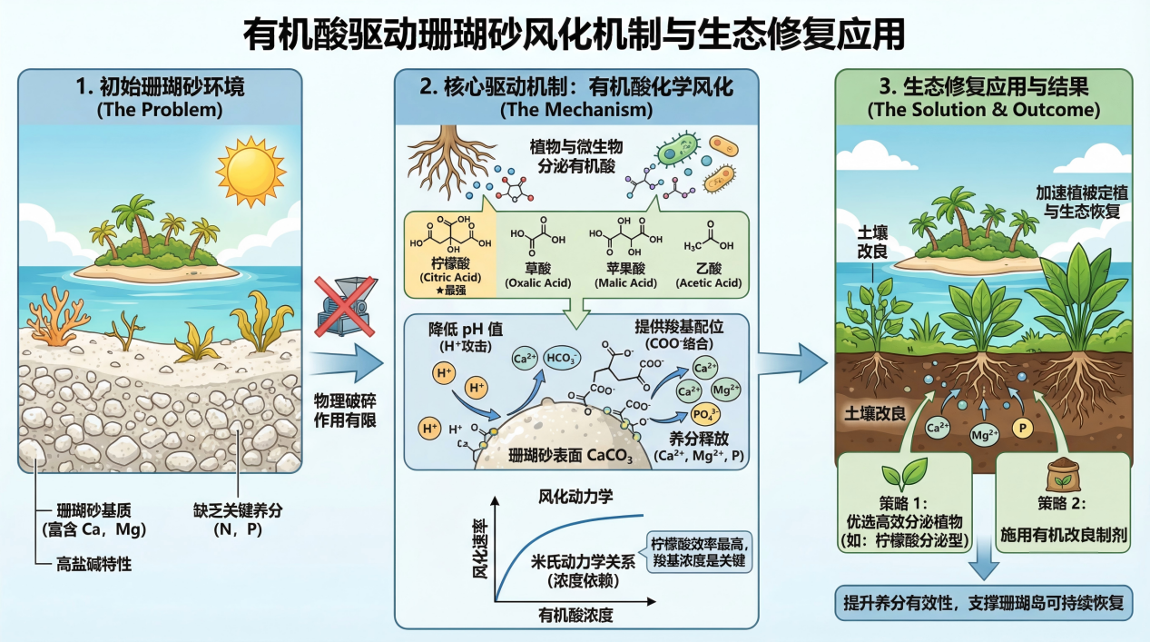 珊瑚砂作为热带珊瑚岛的核心基质,虽富含钙、镁元素,却匮乏氮、磷等关键养分,加之高盐碱的固有特性,极大制约了植物定植与土壤发育进程。过往研究显示,物理破碎(如机械碾磨)是加速珊瑚砂风化的可行途径;而本研究通过室内淋溶实验揭示,植物与微生物分泌的低分子有机酸才是驱动珊瑚砂养分释放的核心动力。