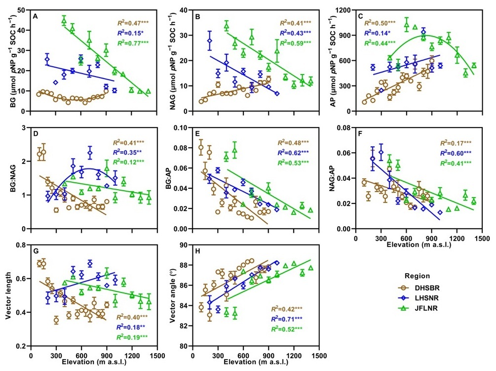 研究团队以广东和海南三条典型热带森林海拔梯度为研究对象,覆盖海拔范围约100—1400米,通过测定土壤胞外酶活性及其化学计量关系,定量评估了微生物对碳、氮和磷的代谢限制格局。结果表明,在不同区域和植被类型下,土壤微生物代谢均呈现显著的磷限制特征,且随着海拔升高、温度降低,微生物对磷的供需失衡程度进一步加剧;相比之下,微生物碳限制整体水平较低,且沿海拔梯度的变化趋势并不一致。