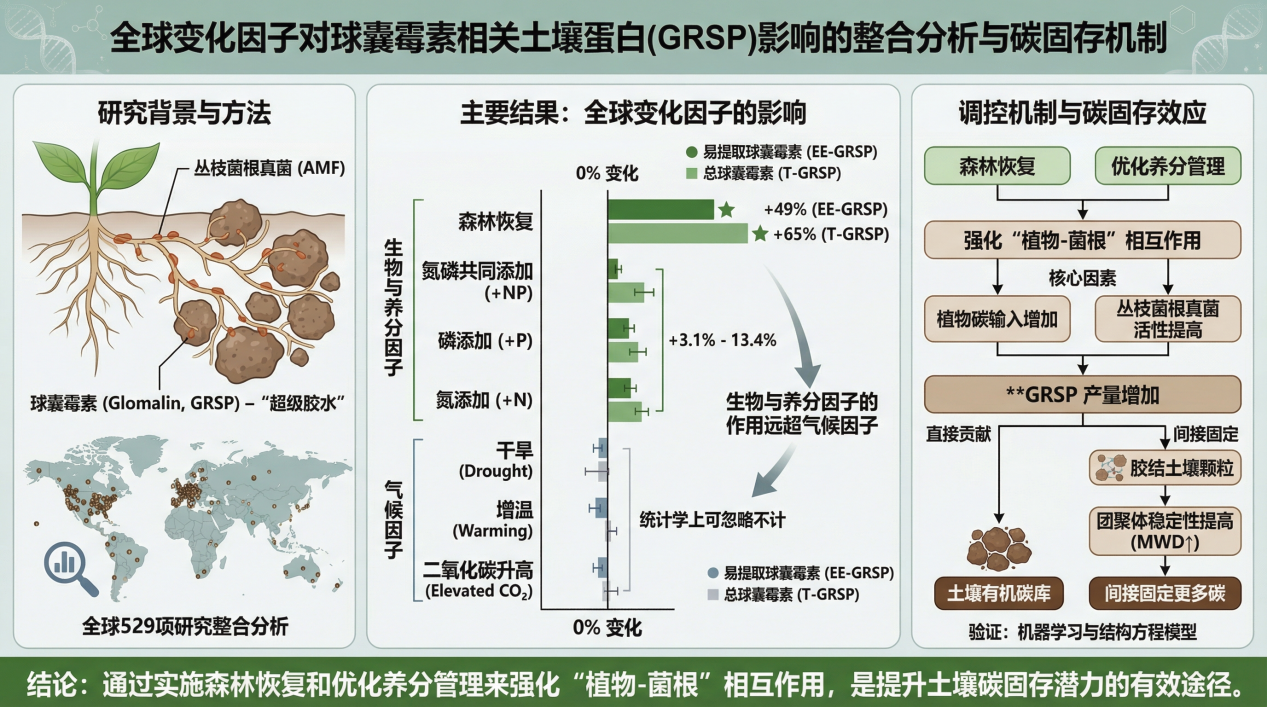 球囊霉素相关土壤蛋白作为丛枝菌根真菌分泌的关键代谢产物,被誉为维持土壤有机碳稳定的“超级胶水”。然而,在全球气候变化的大背景下,这一关键蛋白的动态响应尚未在全球尺度上进行量化。我们基于全球陆地生态系统529项研究的整合分析,系统评估了氮磷添加、气候变暖、二氧化碳浓度升高、干旱以及森林恢复等七大全球变化因子对球囊霉素相关土壤蛋白的影响。研究发现,生物与养分因子的作用远超气候因子。森林恢复对球囊霉素相关土壤蛋白的提升效果极为显著,使易提取球囊霉素相关土壤蛋白和总球囊霉素相关土壤蛋白分别大幅增长49%和65%。