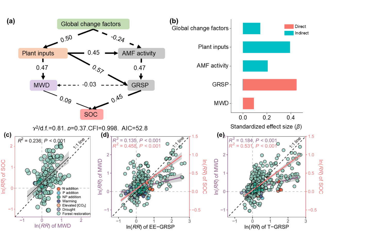 此外,氮、磷及其共同添加通过缓解养分限制,刺激植物碳输入和真菌生长,使球囊霉素相关土壤蛋白含量提升了3.1% - 13.4%。出乎意料的是,二氧化碳浓度升高、增温和干旱对球囊霉素相关土壤蛋白库的影响在统计学上可忽略不计。