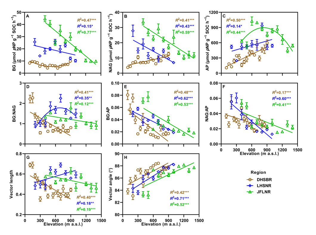 图. 鼎湖山(DHSBR)、莲花山(LHSNR)和尖峰岭(JFLNR)沿海拔梯度的土壤胞外酶活性(A–C)、酶化学计量比(D–F)及微生物养分限制特征(G–H)。数据为平均值 ± 标准误(n = 5)。ns 表示差异不显著;* 表示 p < 0.05;** 表示 p < 0.01;*** 表示 p < 0.001。BG,β-1,4-葡萄糖苷酶;NAG,β-N-乙酰葡萄糖胺苷酶;AP,酸性磷酸酶。向量长度表示微生物碳限制程度,向量角度表示微生物氮或磷限制。
