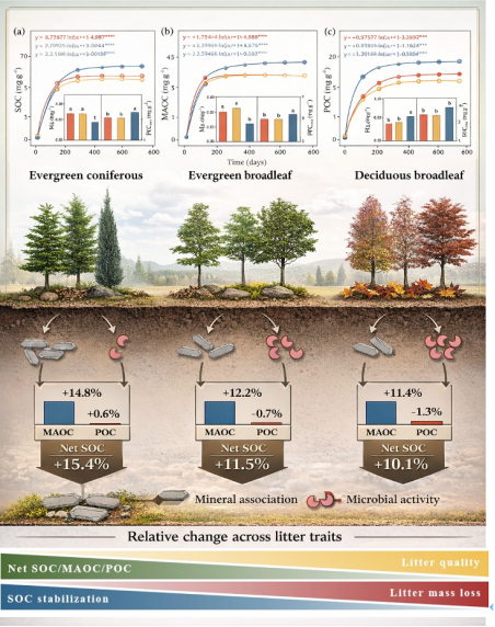 植物凋落物是森林土壤碳库的重要来源,不同植物功能类型凋落物在土壤碳形成与稳定中的作用机制一直存在较大争议。针对这一科学问题,研究团队以我国亚热带森林12种典型树种为研究对象,包括落叶阔叶树、常绿阔叶树和常绿针叶树,通过为期360天的培养实验,并结合天然碳同位素(δ¹³C)示踪技术,系统追踪凋落物来源碳在土壤中的转化过程,定量解析其在矿物结合有机碳(MAOC)和颗粒有机碳(POC)等关键碳组分中的分配特征。研究结果表明,针叶凋落物虽然分解速率比阔叶凋落物低18%—32%,但其对土壤有机碳净积累的贡献却高出1.4—2.1倍,其碳转化效率达到28%—32%,显著高于阔叶凋落物的11%—19%。进一步分析发现,针叶凋落物能够显著促进矿物结合有机碳(MAOC)的形成,而MAOC在土壤有机碳净增加量中的贡献超过一半,表明矿物保护机制在土壤碳长期稳定中发挥关键作用。