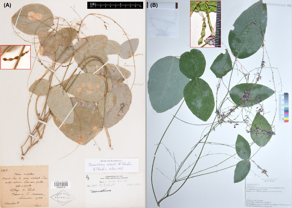 该研究对象是一种名为 Desmodium vidalii (Grona vidalii)的植物,最早于2002年由日本学者大桥广好基于老挝中部的标本描述。在传统分类系统中,它被归入广义的山蚂蟥属,该属曾经包含约275种,广泛分布于全球热带亚热带地区。然而,随着分子系统学的发展,科学家们发现广义的山蚂蟥属实际上是一个高度多系的类群,即其中包含多个不直接相关的演化支系。经过系统修订,原属下的物种已被重新划分到18个不同的属中。目前狭义的山蚂蟥属主要分布于美洲,在非洲仅有一种分布,而亚洲并无自然分布。