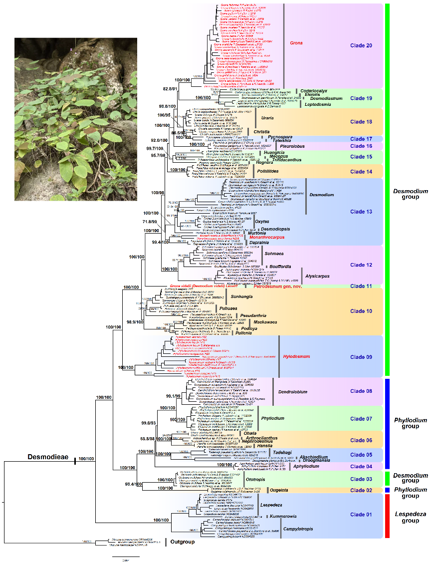 为了明确该物种的系统位置,研究团队进行了广泛的分子系统发育分析。他们获得了山蚂蟥族全部47个属及约32%的物种的样本,利用叶绿体序列、核核糖体序列以及353个单拷贝核基因等多套数据进行建树。分析结果清晰显示:Desmodium vidalii 在所有系统发育树中均构成一个独立的演化支系(Clade 11),与长柄山蚂蟥属、单节豆属和假地豆属明显区分开来。这一结果在质体和核基因数据中高度一致。