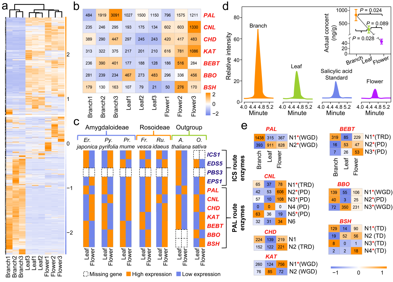 图2. 蔷薇科物种全基因组表达模式及水杨酸(SA)生物合成通路相关酶谱分析