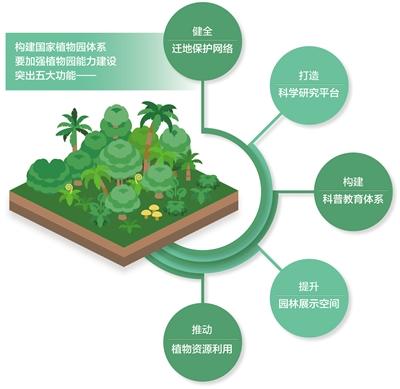 “构建国家植物园体系,要加强植物园能力建设,突出五大功能。”周志华介绍,一是健全迁地保护网络,建立野生植物迁地保护栽培繁育体系、迁地保护信息平台和综合保藏体系,提升迁地保护综合保藏能力,这是核心功能;二是打造科学研究平台,开展迁地保护基础科学研究活动,加强植物保护国际国内交流合作,持续推进植物保护专业人才培养;三是构建科普教育体系,建设科普教育平台,实施科普教育培训计划;四是提升园林展示空间,创新园林园艺展示方式,促进公众深入了解和支持国家植物园建设;五是推动植物资源利用,加大引种驯化和新品种开发力度,提升城市生态建设和产业服务水平。