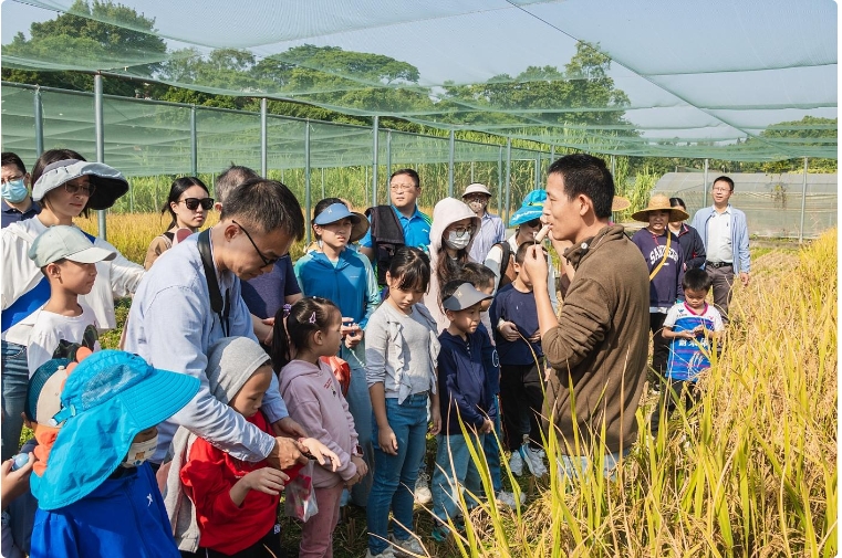 在华南国家植物园里的水稻基地,大小朋友进行水稻实地观察和收割体验