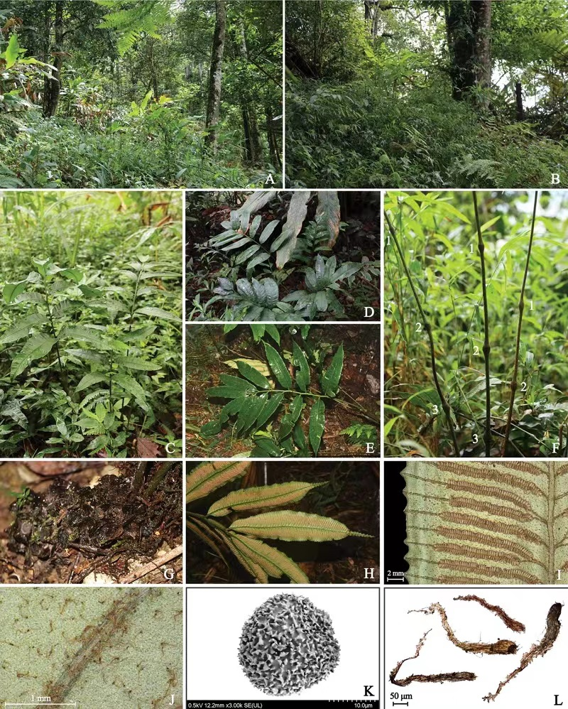 瘤柄观音座莲(A, B 生境;C, D, E 叶片;F 叶柄;G 根状茎;H, I 孢子囊群;J 羽片背面,示节状毛;K 孢子纹饰;L 叶柄鳞片)。研究团队供图