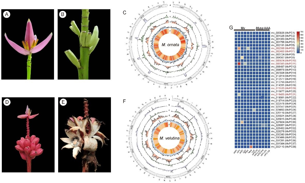 紫苞芭蕉和朝天蕉的花果、基因组信息及PG基因在不同组织中的表达水平。研究团队供图
