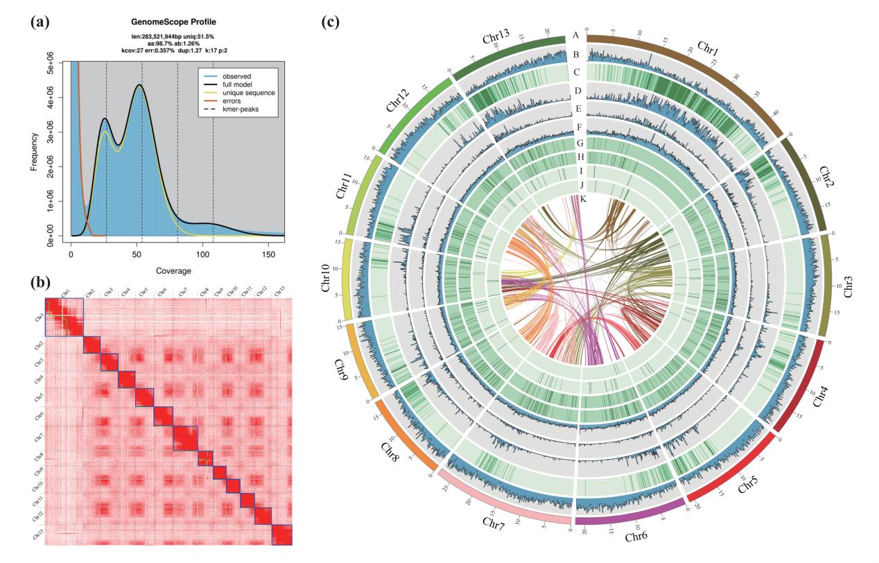 粗叶榕的基因组组装与注释(a. 基因组大小评估;b. Hi-C互作热图;c. 基因组圈图)。研究团队供图