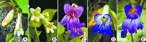 A:淡黄报春苣苔。B:多色报春苣苔。C:湖南报春苣苔。D:多葶报春苣苔。E:遂川报春苣苔。柯富士供图