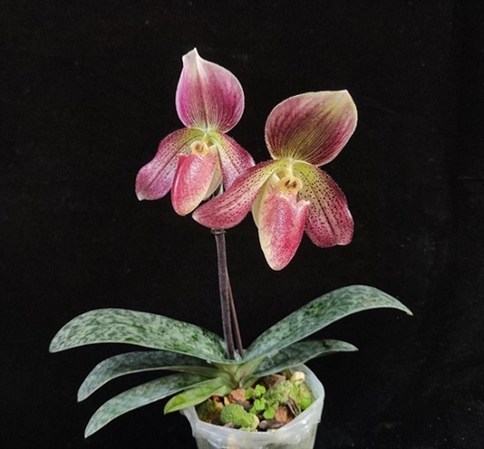 “斑蝶兜兰”是2015年以引进的巨瓣兜兰‘B-1’为母本、胼胝兜兰‘C-1’为父本进行杂交,经无菌播种选育而成。花序梗深紫色,长12.0厘米;着花1.7朵,花朵横径8.1厘米、纵径8.9厘米;中萼片长4.4厘米、宽4.3厘米,浅紫色,基部绿色;花瓣长5.4厘米、宽2.3厘米,浅紫色,基部绿色,具深紫色细斑点;唇瓣长4.4厘米、宽1.6厘米,深囊状,紫色。在珠江三角洲地区设施栽培条件下,3-4月开花,单花观赏期45天,抗病性、抗逆性较强。