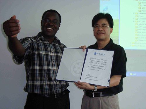 周国逸研究员向Dennis Otieno博士颁发“外籍青年科学家”证书