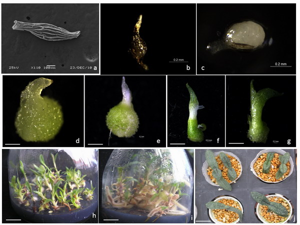 针对上述问题,华南植物园硕士研究生张艳艳在其导师曾宋君研究员、上海辰山植物园黄卫昌副园长等的指导下,对杏黄兜兰萌发困难的机制作了深入的研究并找到了解决其萌发困难的方法。实验结果表明:杏黄兜兰在成熟过程中经历了从低到高并急剧下降的萌发趋势;成熟种子无菌萌发率下降的原因与其种皮角质化形成不透水的保护层及其内部营养物质的消失具有重要的关系;选择合适胚龄的种子利用合适的培养基进行播种,利用合适浓度、合适时间的次氯酸钠处理成熟种子能有效地提高萌发率。